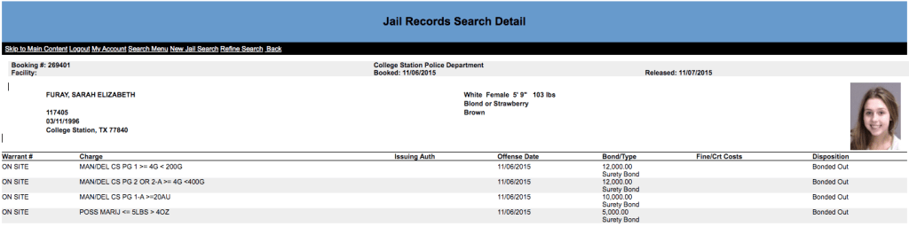 According to Brazos County court records, Sarah Elizabeth Furay, who made headlines for her smiling mugshot and familial relationship to a DEA agent, pled guilty to four charges on Friday, October 9, 2020. The charges, stemming from her November 6, 2015 arrest in College Station, were controlled substance possession, manufacture, and delivery . According to the Brazos County Judicial Records Search website, punishment hearings are set for November 3 and 4 in the Honorable Travis Bryan’s 272nd District Court.
